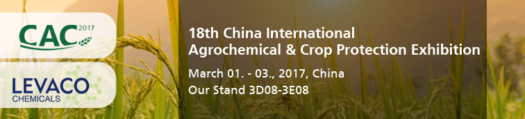 Wir die LEVACO Chemicals GmbH, sind zusammen mit dem lokalen Partner H.J. Unkel auf der China International Agrochemical and Crop Protection Exhibition in Shanghai, China vertreten. Vom 1. bis zum 3. März 2017 stellen wir unsere innovativen Produkte und Entwicklungen für agrochemische Formulierungen vor. Sie finden uns auf unserem Messestand Nr. 3D08 -3E08.