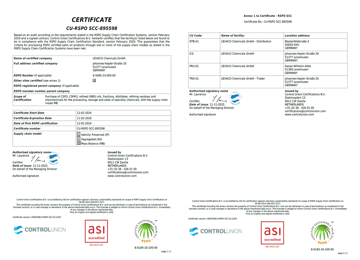 We supply, develop and produce economical, ecological and socially responsible products. In this way, the application of our additives and solutions contributes to transparency along the value chain. The products from our company have the following certificates, depending on the field of application: